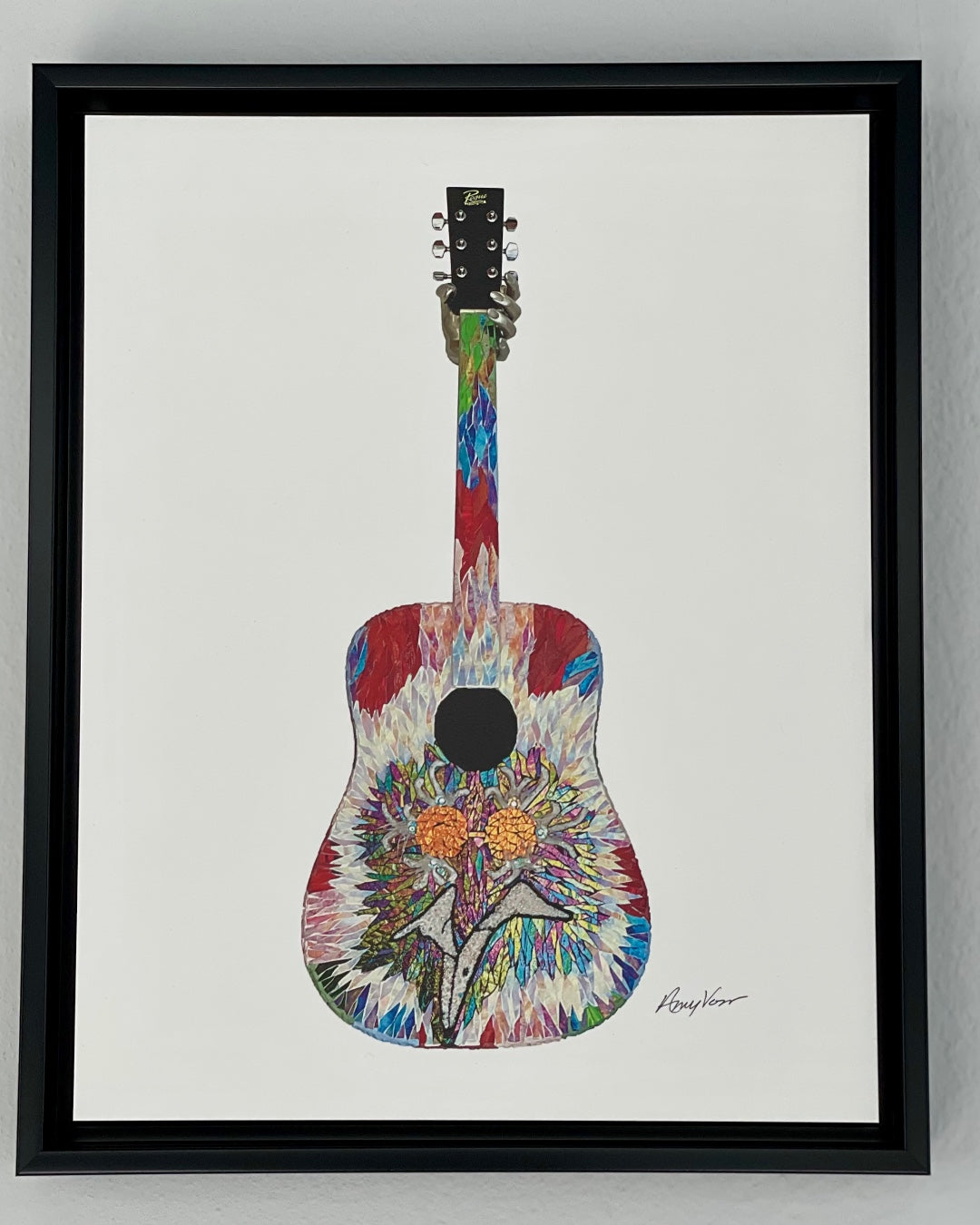 Glass guitar sculpture printed on textured fine art paper & framed in black floating frame